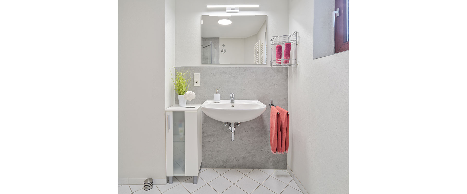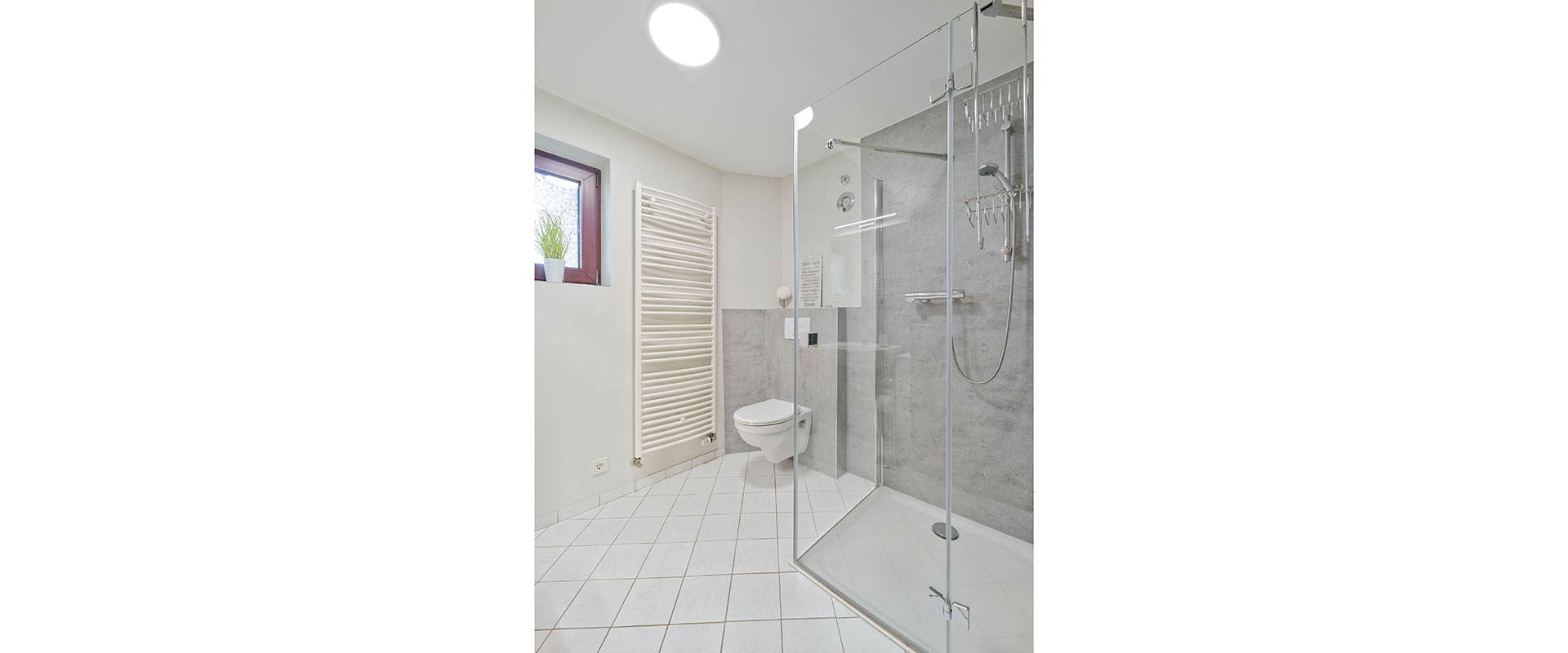 1 Bad mit bodentiefer Dusche, Waschbecken, Toilette, Kosmetiktücher, Kosmetikspiegel, Handseife, 1 Föhn, Fenster.